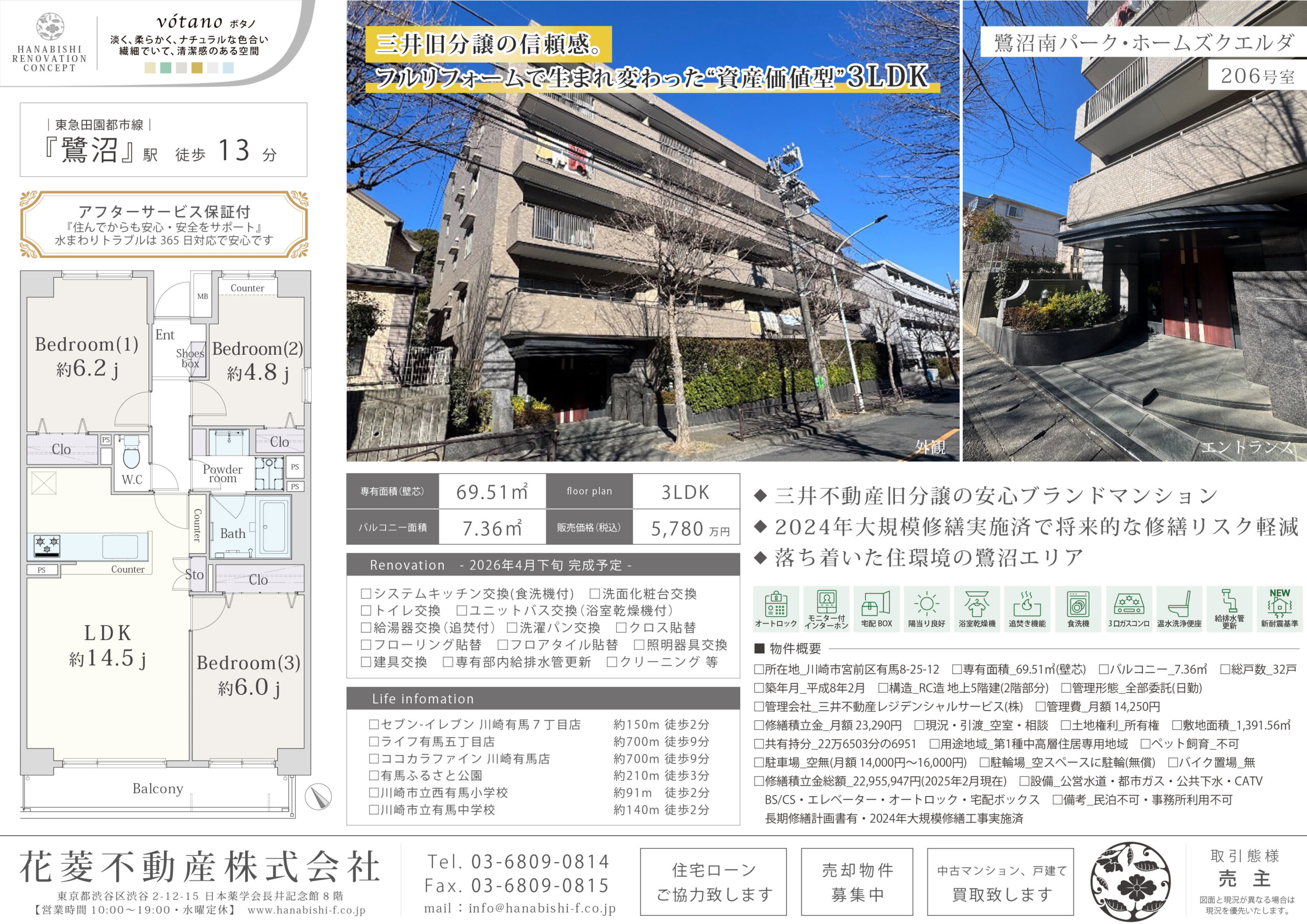 | リノベーション内容 | システムキッチン交換(食洗機付) / 洗面化粧台交換 / トイレ交換 / ユニットバス交換(浴室乾燥機付) / 給湯器交換(追焚付) / 洗濯パン交換 / クロス貼替 / フローリング貼替 / フロアタイル貼替 / 照明器具交換 / 建具交換 / 専有部内給排水管更新 / ハウスクリーニング 等(2026年4月下旬 完成予定) |