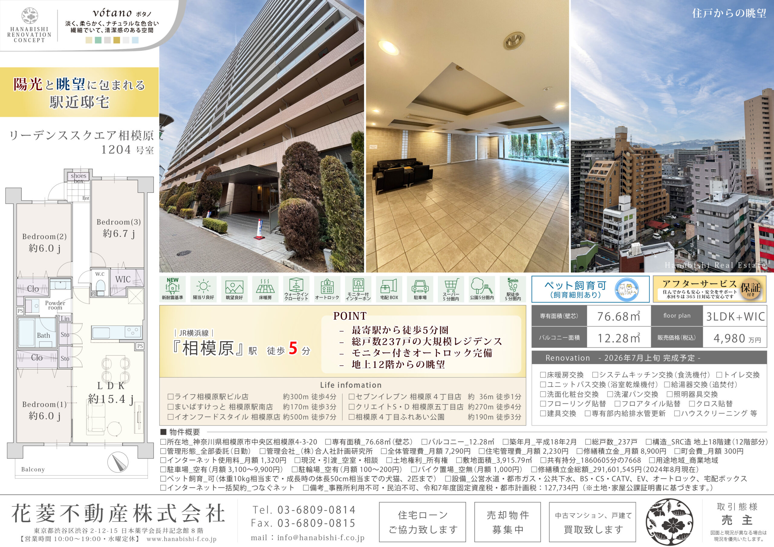 | リノベーション内容 | 床暖房交換 / システムキッチン交換(食洗機付) / トイレ交換 / ユニットバス交換(浴室乾燥機付) / 給湯器交換(追焚付) / 洗面化粧台交換 / 洗濯パン交換 / 照明器具交換 / フローリング貼替 / フロアタイル貼替 / クロス貼替 / 建具交換 / 専有部内給排水管更新 / ハウスクリーニング 等(2026年7月上旬 完成予定) |