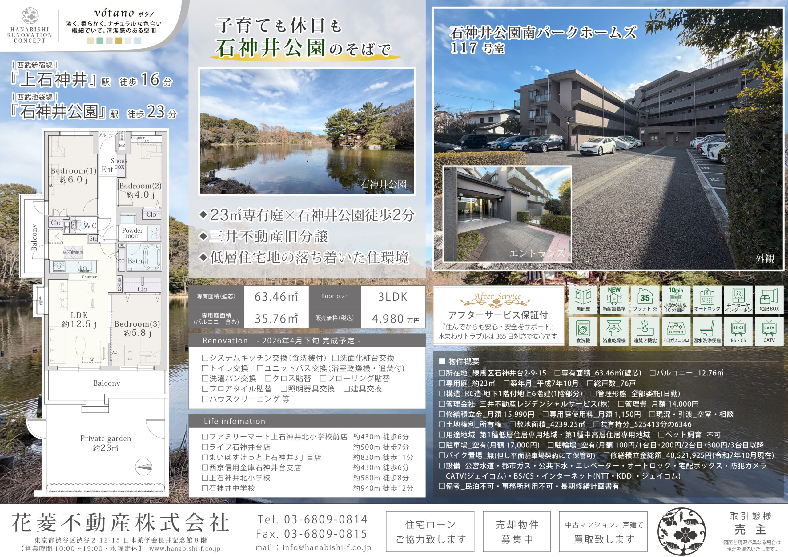 | リノベーション内容 | システムキッチン交換(食洗機付) / 洗面化粧台交換 / トイレ交換 / ユニットバス交換(浴室乾燥機・追焚付) / 洗濯パン交換 / クロス貼替 / フローリング貼替 / フロアタイル貼替 / 照明器具交換 / 建具交換 / ハウスクリーニング 等(2026年4月下旬 完成予定) |